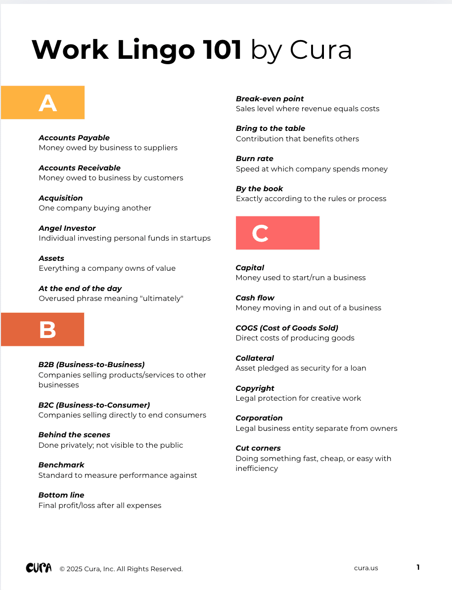 No more nodding and Googling later. Download this 5-page quick reference guide to workplace lingo you’ll actually use (and need to know!)